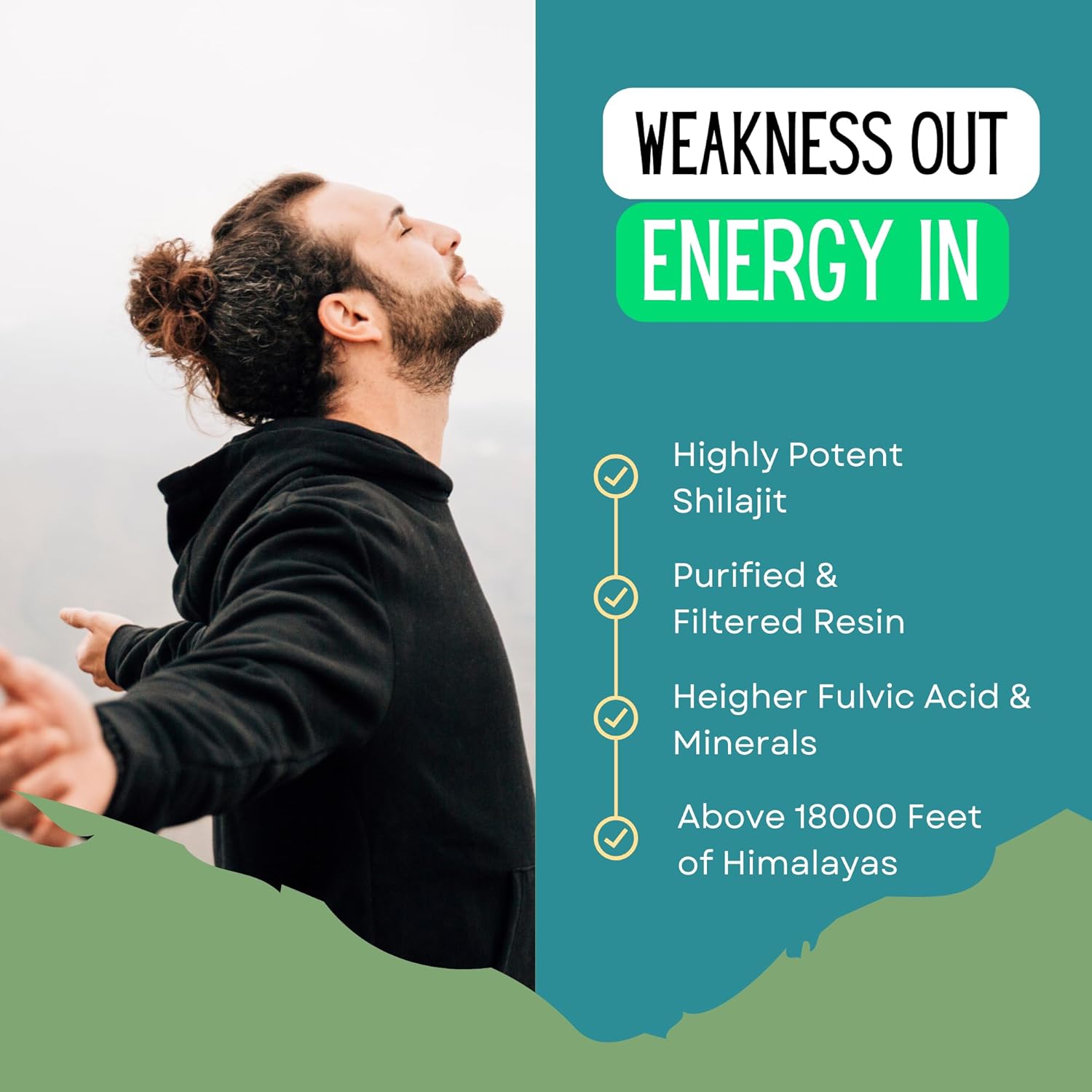 Shilajit is made up of organic substances compressed within rock layers, along with rock minerals and humus. It contains humins, humic acid, and 76% primarily fulvic acid